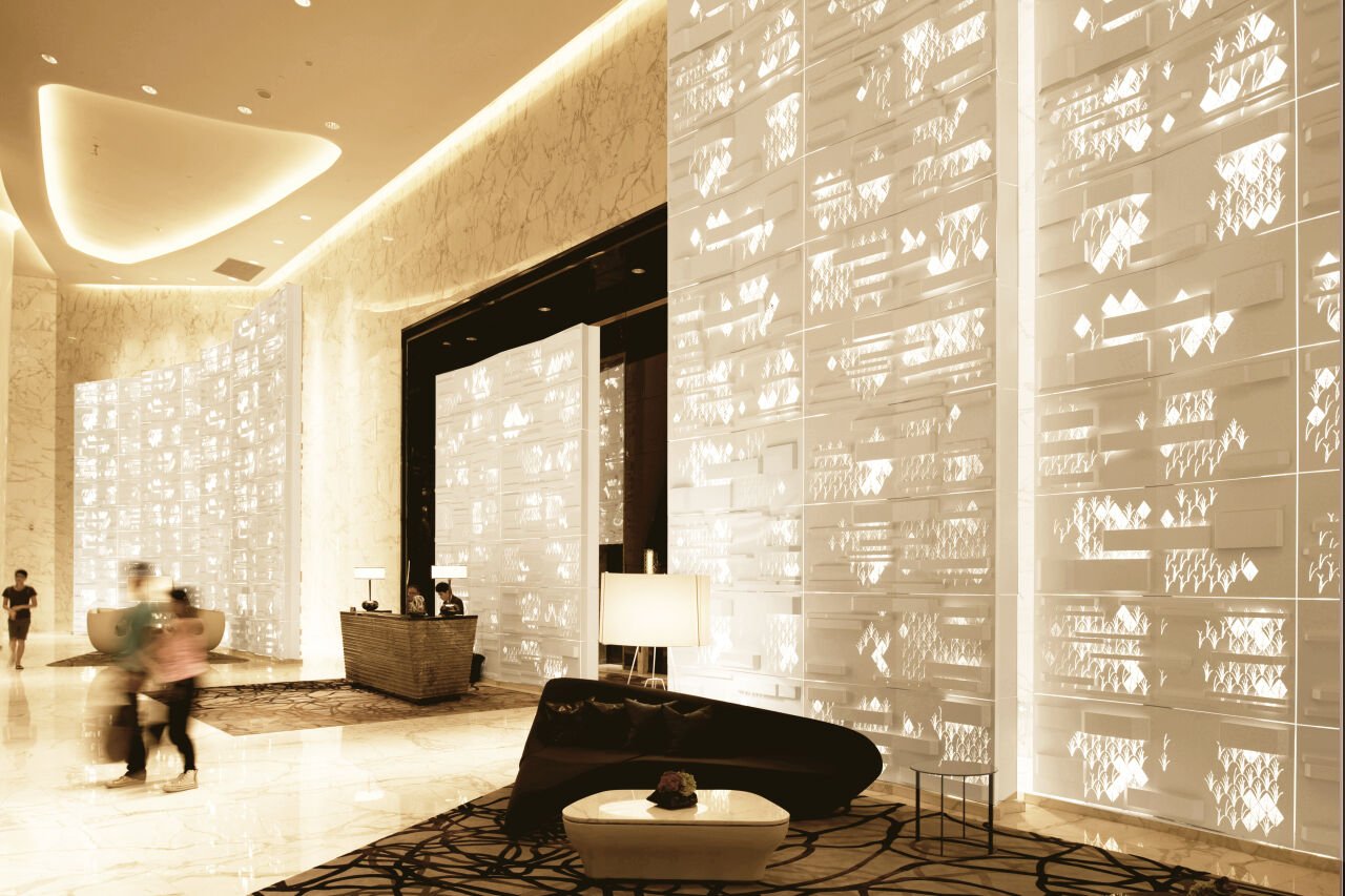 Hirsch Bedner Associates Interior Architects collaborated with UAP on the design of three highly integrated decorative screens for the major lobbies at Guangzhou’s Four Seasons Hotel. This collaboration resulted in dramatic, textured, backlit feature screens, a highlight for visitors and a signature design element for this award-winning hotel.